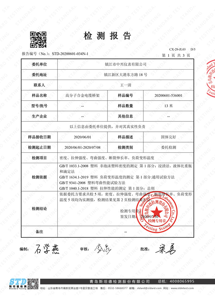 資質(zhì)證書 Qualification certificate高分子合金電纜橋架檢測報告 STD-20200601-034N-1