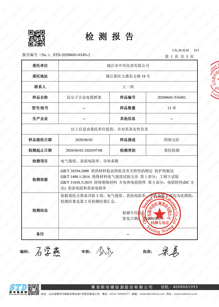 資質(zhì)證書 Qualification certificate高分子合金電纜橋架檢測報告 STD-20200601-034N-2