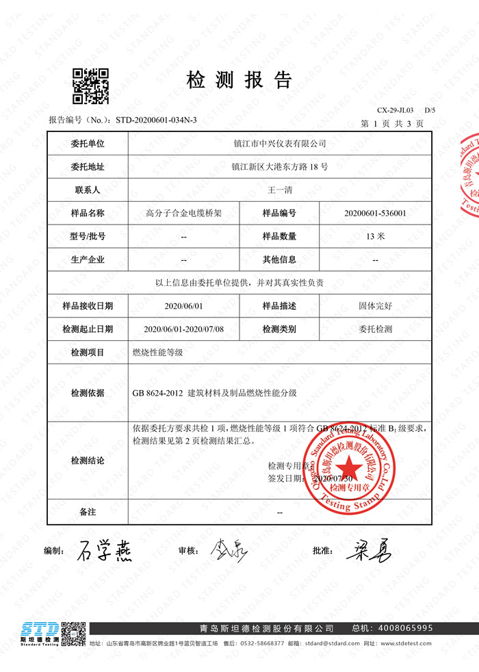 資質(zhì)證書 Qualification certificate高分子合金電纜橋架檢測報告 STD-20200601-034N-3