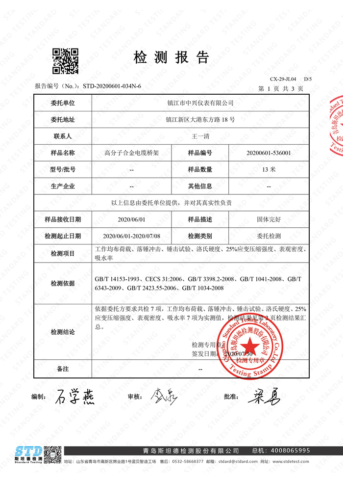 資質(zhì)證書 Qualification certificate高分子合金電纜橋架檢測(cè)報(bào)告 STD-20200601-034N-6